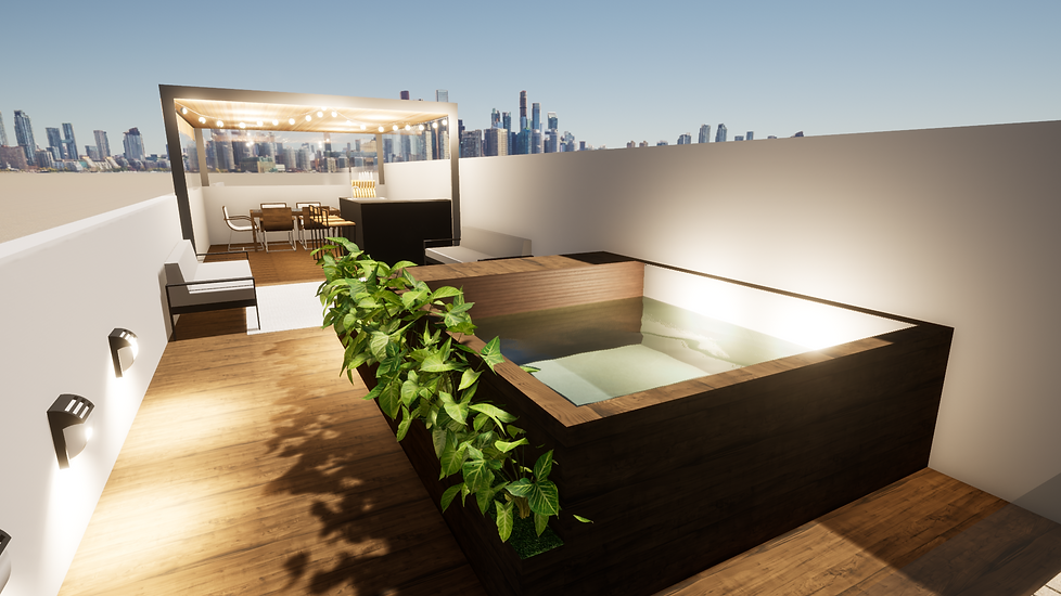 La terraza se compone de una pérgola que permite que debajo de ella se encuentre un espacio de cocina/comedor con ventanas que recubren 3 de sus laterales, permitiendo el paso de la luz y su correcta ventilación. También el área posee una pequeña piscina con el fin de crear un lugar de recreación, donde pudiera compartir tanto solo como con amigos. Este espacio posee la correcta iluminación en su paso y vegetación que genera armonía entre todos los materiales, al mismo tiempo que da vida a la terraza en su totalidad.